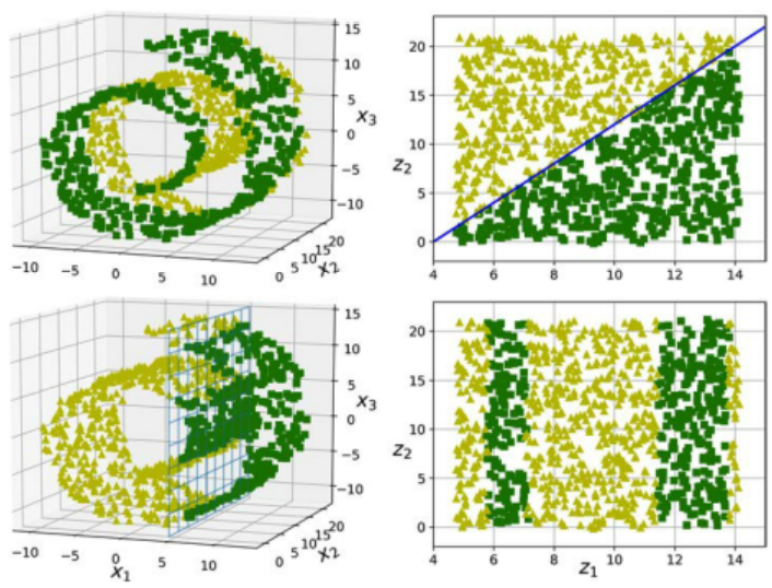 저차원의 평면에 훈련 세트를 투영하기 전에 올바른 초평면을 선택해야 합니다.