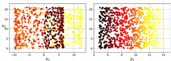 우리가 원하는 건 스위스 롤을 펼쳐서 오른쪽처럼 데이터셋을 차원 축소하는 것입니다.