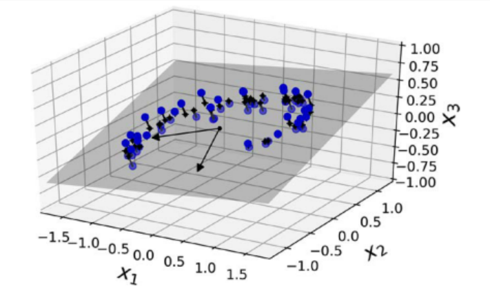먼저 데이터에 가장 가까운 초평면을 정의한 다음 데이터를 이 평면에 투영시킵니다.