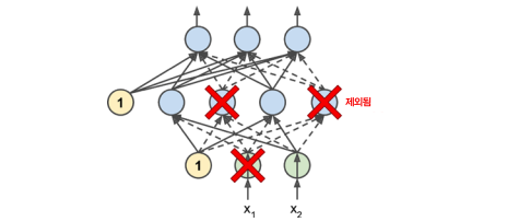 드롭아웃 규제, 제거된 뉴런은 이 반복에서 0을 출력합니다.