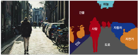 시맨틱 분할을 쓰면 각 픽셀은 아래 그림에서처럼 픽셀이 속한 객체의 클래스로 분류됩니다. 클래스가 같은 물체는 구별되지 않습니다.