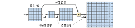 좋은 방법이지만 여전히 정확도가 떨어집니다. 따라서 저자들은 아래쪽 층에서부터 스킵 연결을 추가했습니다. 예를 들어 2배로 출력 이미지를 업샘플링하고 아래쪽 층의 출력을 더하여 해상도를 두 배로 키웁니다. 그 다음 이 결과를 16배로 늘려서 업샘플링하여 최종적으로 32배의 업샘플링을 달성합니다. 비슷하게 두 번째 스킵 연결을 사용해 더 낮은 층의 세부 정보를 복원해 최상의 구조를 만들었습니다. 요약하면 다음과 같은 과정을 거칩니다. 2배 업샘플링, 동일한 크기의 아래쪽 층 출력을 도함, 2배 업샘플링, 더 아래쪽 층의 출력을 더함, 마지막으로 8배 업샘플링입니다.