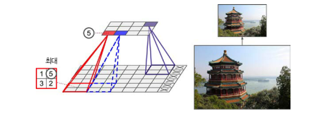 합성곱 층과 마찬가지로 풀링 층의 각 뉴런은 이전 층의 작은 사각 영역의 수용장 안에 있는 뉴런의 출력과 연결되어 있습니다. 이전처럼 크기, 스트라이드, 패딩 유형을 지정해야 합니다. 하지만 풀링 뉴런은 가중치가 없고, 최대나 평균 같은 합산 함수를 사용해 입력값을 더하는 것이 전부입니다. 아래는 최대 풀링 층의 예시입니다.