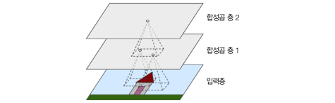 어떤 층의 한 뉴런은 수용장에 해당하는 만큼의 이전 층의 뉴런의 출력과 연결됩니다.