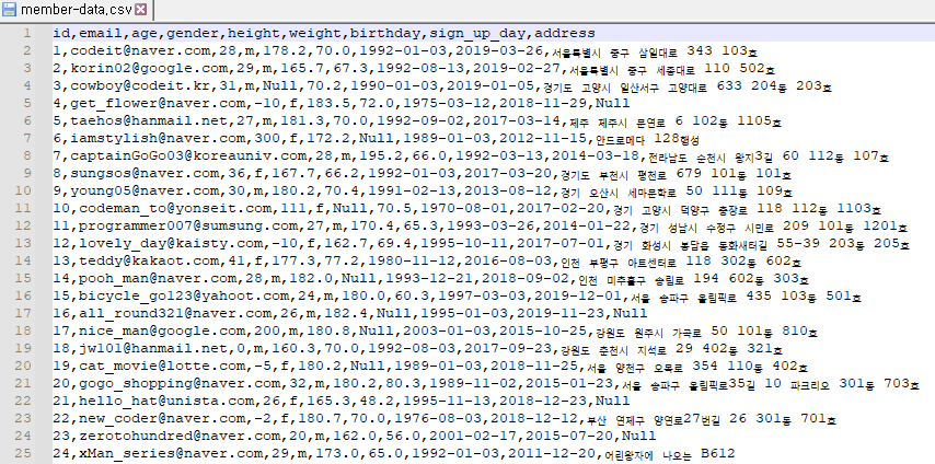 컴퓨터에 MS Office가 설치되어 있다면 아마 CSV파일이 Excel로 열리게 되어있을 텐데, CSV 파일의 가장 raw 한 모습을 보고 싶다면 간단한 text editor를 이용해서 열어보는 것이 좋습니다.