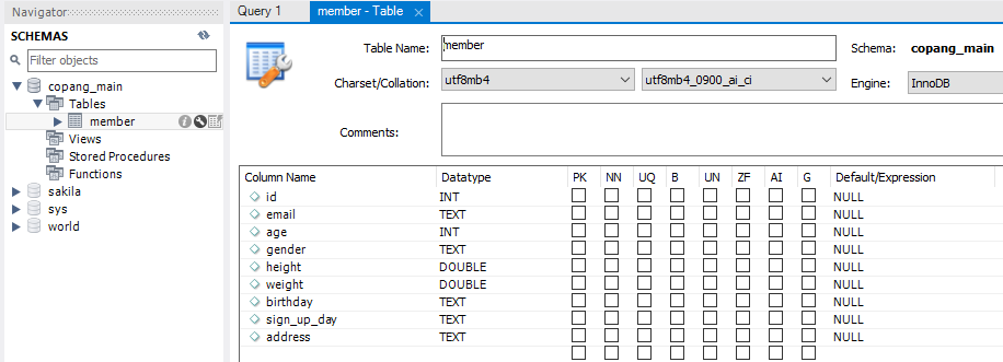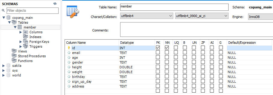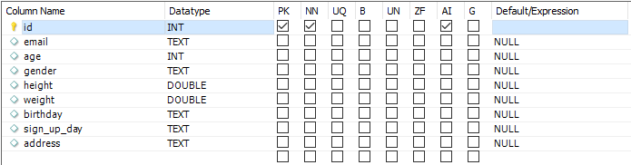 앞서 id를 Primary Key로 설정하면서 PK 체크박스에 체크를 했는데, 이 때 NN도 같이 체크가 된 모습을 볼 수 있습니다. 이 NN은 NOT NULL의 줄임말입니다. primary key는 항상 NOT NULL이어야 합니다.